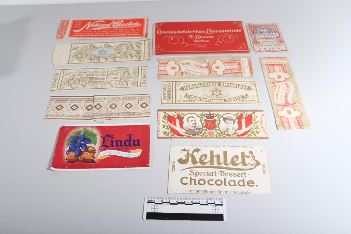 Umbúðir af súkkulaði og ýmsu fleiru. Börn gerðu sér það oft að leik að safna fallegum umbúðum. Þessar eru frá 5. og 6. áratug 20. aldar. Gefandi er Ingibjörg Sigurðardóttir frá Varmalandi í Sæmundarhlíð.