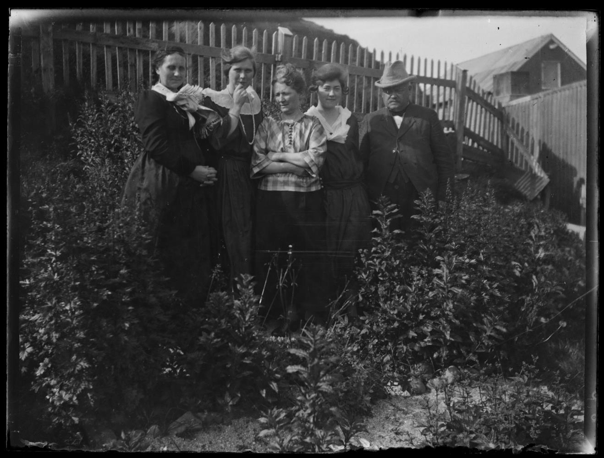 Fólk uppstillt við gróður í afgirtum garði. Sér til húsa í bakgrunni. Sæmundur Halldórsson og Magdalena Hjaltalín.
