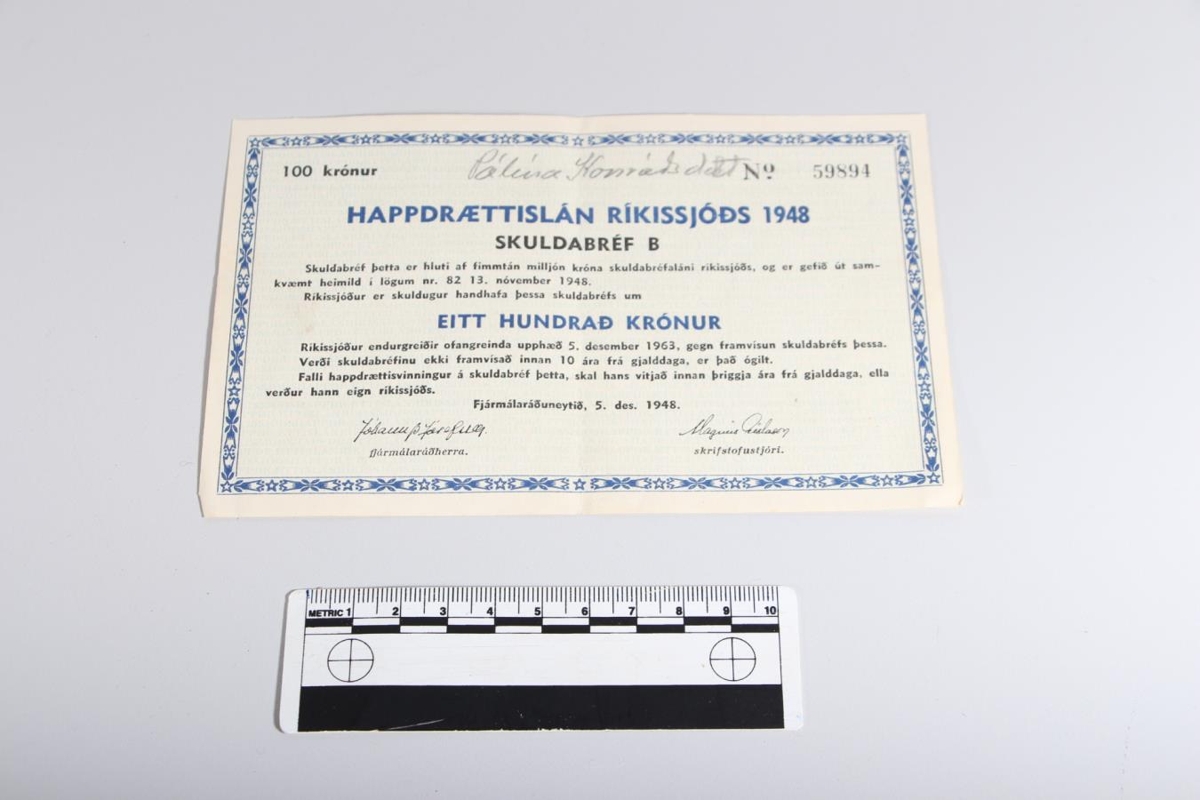 Happdrættismiði, hvítur 16,5 x 10,4 cm með bláu letri. 100 kr miði á Happdrættislán Ríkissjóðs 1948 úr eigu Pálínu Konráðsdóttur frá Skarðsá. Algengt var að fólk keypti happdrættismiða til að styrkja ríkissjóð á þessum tíma. Miðinn er nr. 59894. Gefandi er Ingibjörg Sigurðardóttir frá Varmalandi í Sæmundarhlíð.