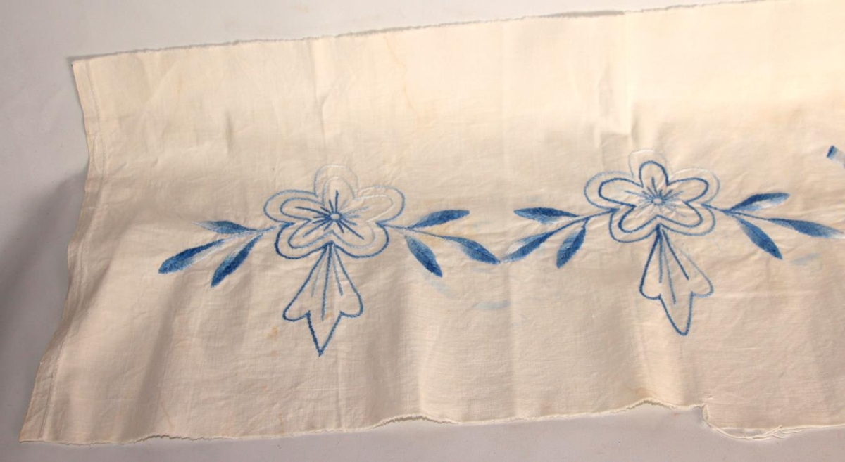 Millistykki af sængurveri úr bómull. Hvítt með bláum útsaumi. Lengd 125 cm og breidd er 30 cm. Í miðju eru upphafsstafirnir JG saumaðir með mislöngu spori og aftursting, með bláu bómullargarni, misbláu, frá ljósu yfir í dökkt. Undir stöfunum er blómamynstur með blöðum og sömuleiðis út frá stöfunum alla breiddina. Samtals þrjú blóm sín hvoru megin. Stykkið er lítið eitt blettótt og götótt.