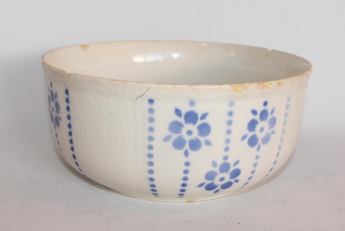 Skál úr postulíni, með bláu blómamynstri. Þvermál 22 cm, dýpt 10 cm. Aðeins brotið úr börmum, annars í góðu lagi. Gamalleg. Á botni er framleiðslumerki ,,VEB / STEINGUT FABRIK / [ólæsilegt] / MADE IN GERMANY / NR. 36".