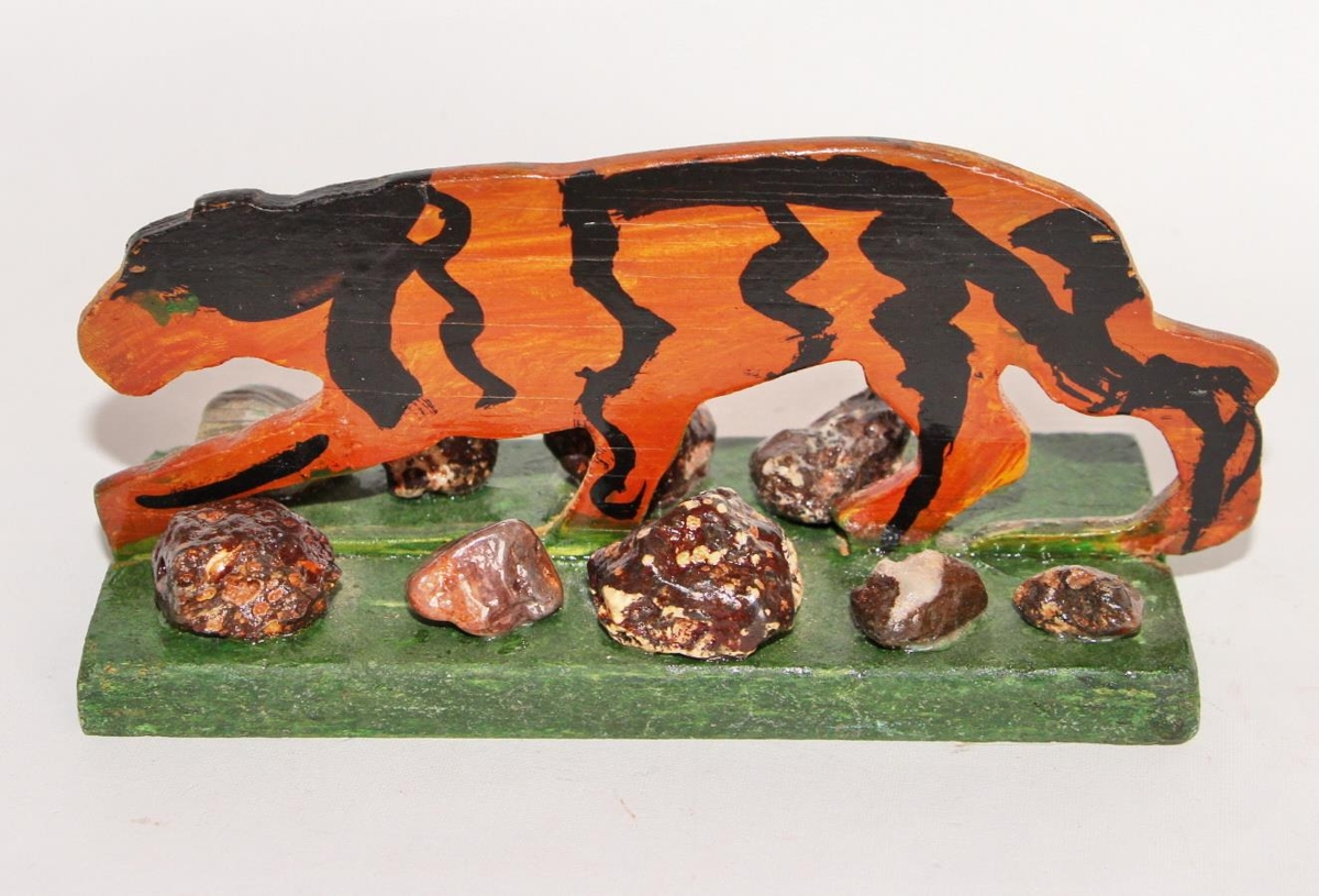 Tígrisdýr úr krossvið, málað brúnt með svörtum röndum. Útsagað og fest á grænan pall sem er 13 x 4,2 cm og á eru límdir níu steinar.