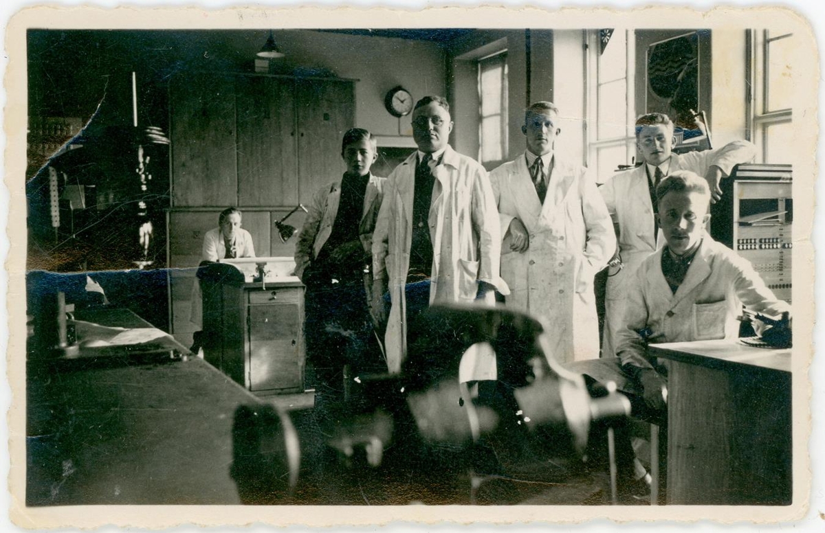 Hópur karlmanna á hvítum vinnusloppum stilla sér upp til hópmyndatöku inni á refeindaverkstæði.