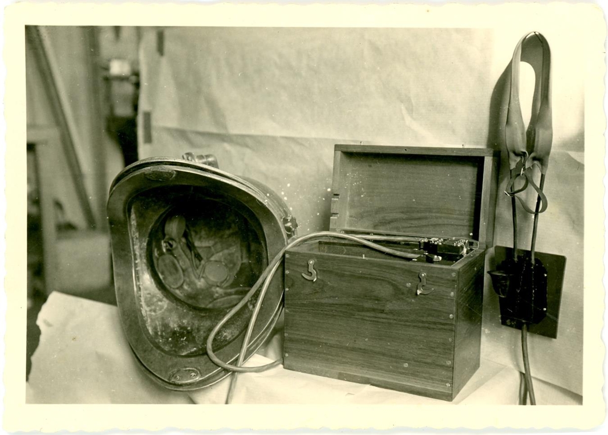 Kafarahjálmur, símtæki í trékassa og heyrnartól ásamt áföstum hljóðnema t.h. Á bakhlið er skrifað: Kafarasími. 1936.