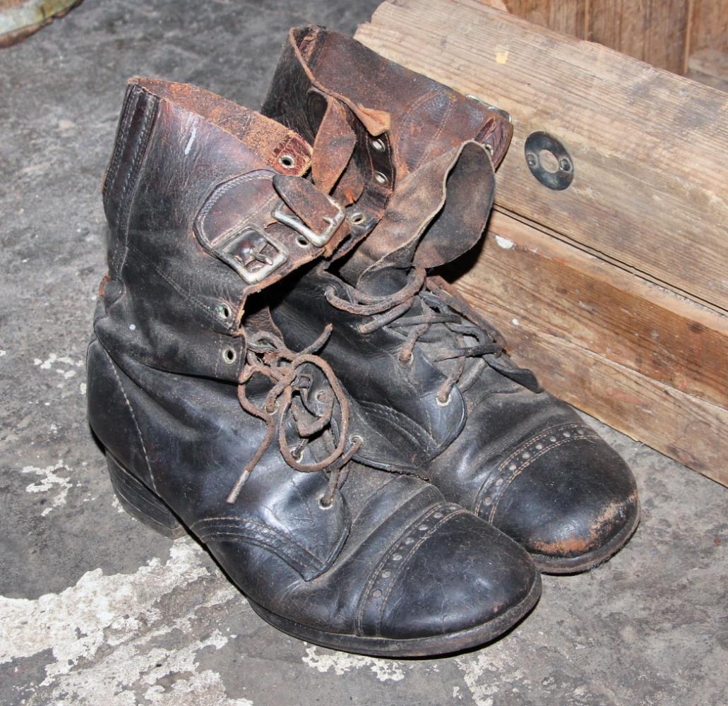 Skór úr leðri. Nr. 5 1/2, uppreimaðir og með 4 cm háum hæl. Efst eru tvær leðurólar sem hægt er að spenna yfir reimarnar.