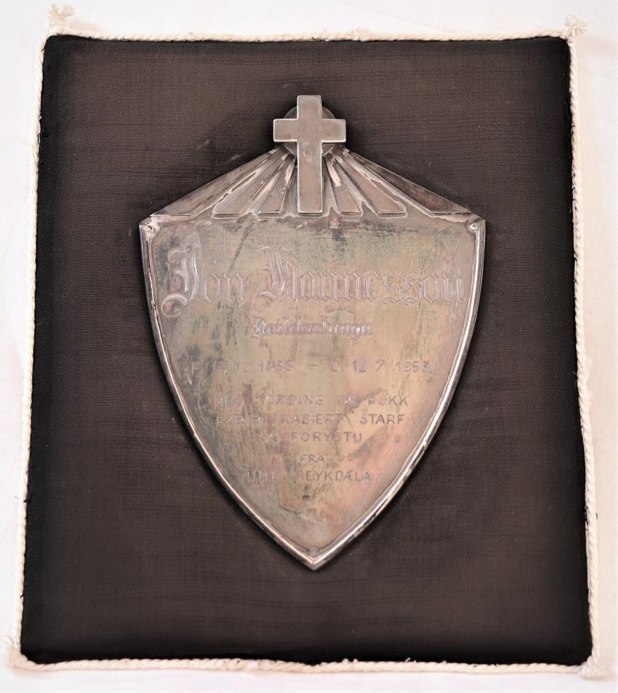Minningarskjöldur frá Ungmennafélagi Reykdæla til minningar um Jón Hannesson (5.12.1885-12.7.1953) frá Deildtartungu. Ekkja hans, Sigurbjörg Björnsdóttir (18.11.1886-12.1.1984) gaf safninu gripinn.