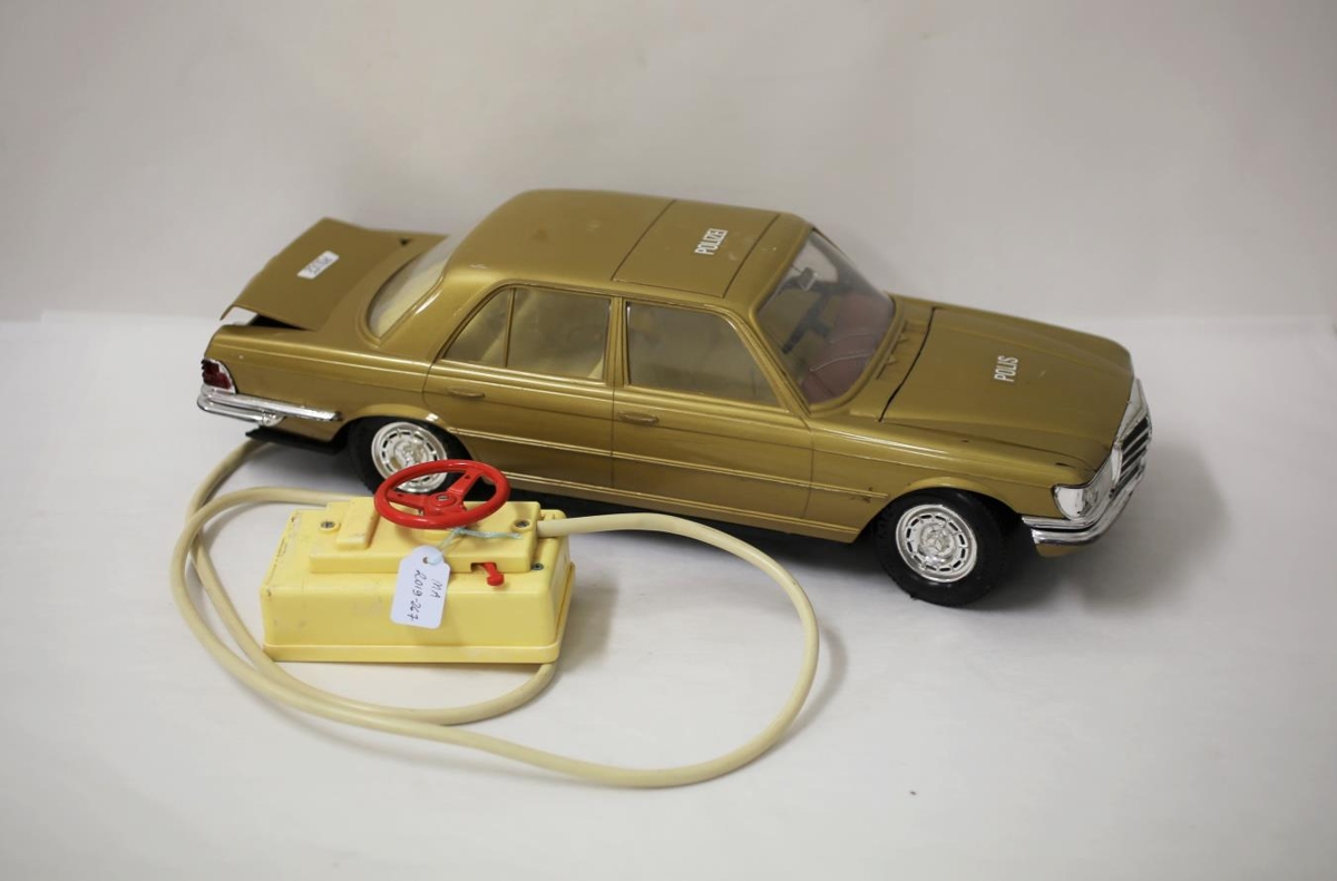 Fjarstýrður lögreglubíll, með snúru. Teg. Mercedes Benz. Gylltur með svörtum dekkjum. Á húddinu stendur "Polis", á þakinu "Polizei" og á skottinu "Police". Á númeraplötunni aftan á stendur svo "Diplomatico" og þar við hliðina "450 SE". Á fjarstýringunni er rautt stýri til að stýra bílnum.