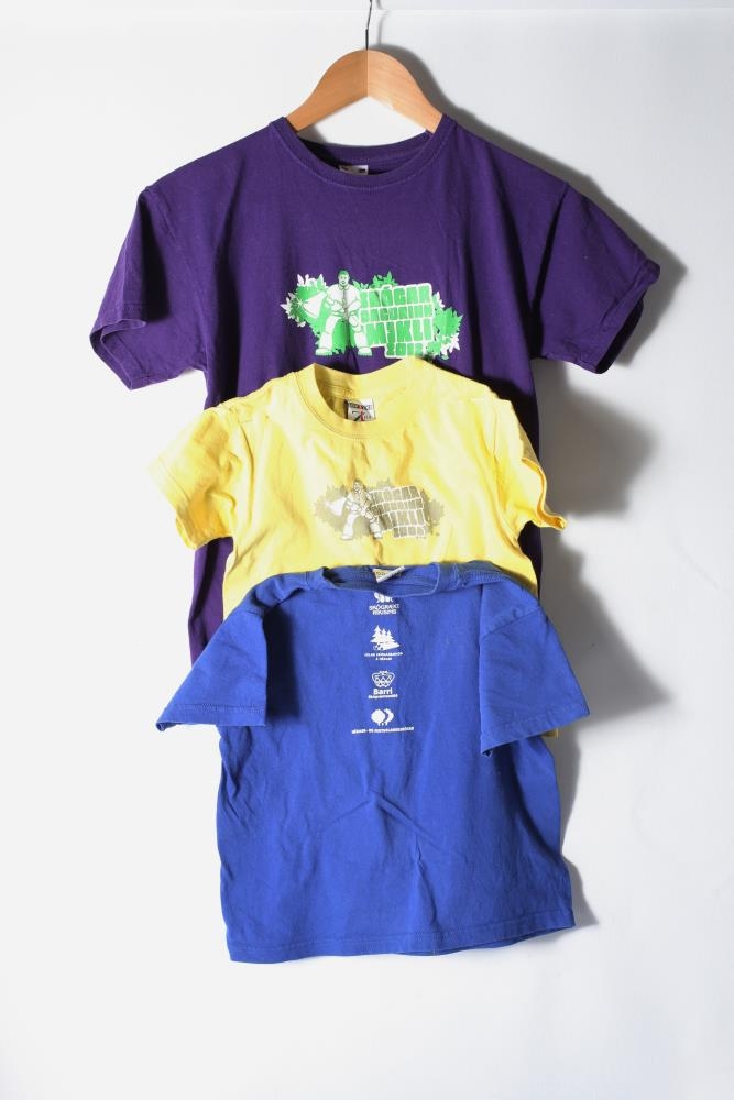 Þrír stuttermabolir; gulur, fjólublár og blár - framleiddir fyrir Skógardaginn mikla í Hallormsstaðaskógi, þrjú mismunandi ár.