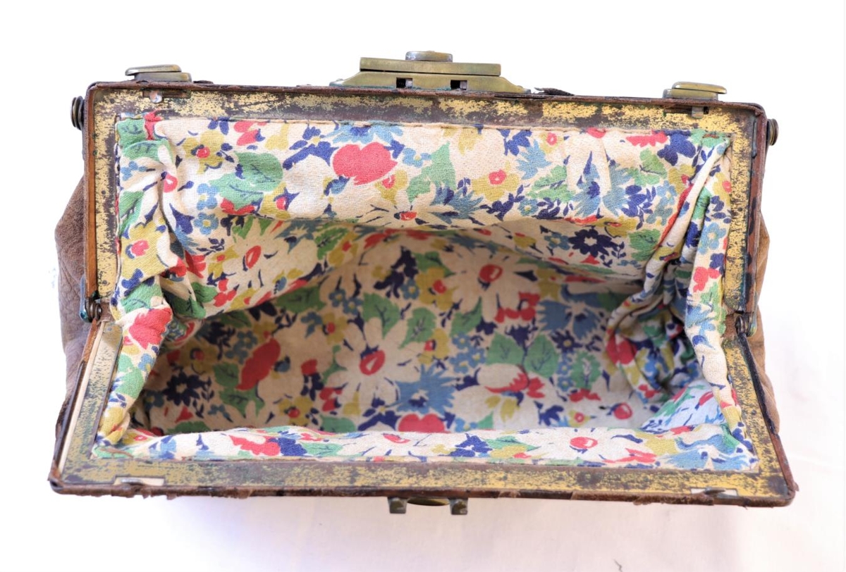 Brún handtaska úr krókódílaskinni. Þrjár látúnsmellur á málmloku. Nokkur spansgræna. Mjó leðuról fest með látúnslykkjum hvoru megin loku. Fóður úr litríku efni (silki) með blómamynstri. Taskan var í eigu Ingibjargar Emmu Guðmundsdóttur Björnsson (5.7.1903 - 27.6.2001). Hún var sýsluskrifari í Borgarnesi 1920-28, á skrifstofu K.B. 1931-34. Fluttist til Reykjavíkur 1936 og vann þar við skrifstofustörf. Ingibjörg var formaður UMF Skallagríms í Borgarnesi 1922-27. Ingibjörg var ógift og barnlaus.