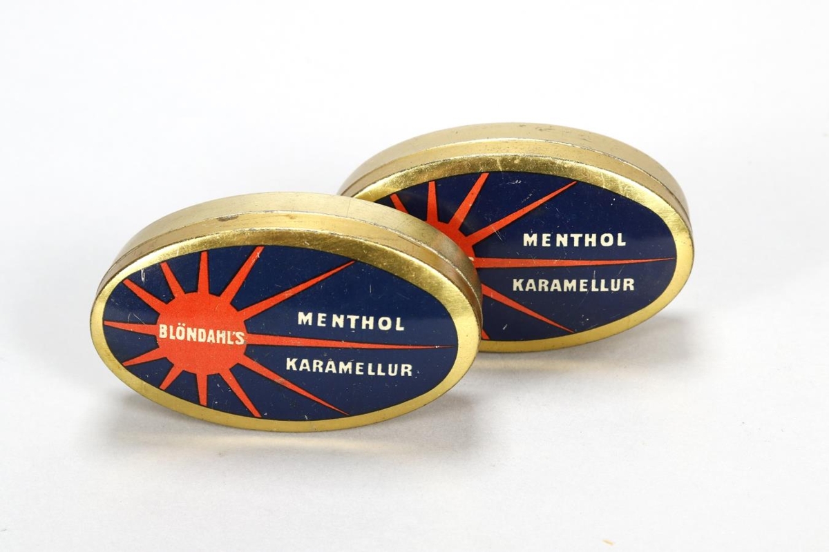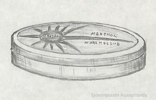 Tvær dósir undan sælgæti. Úr fórum Guðrúnar Jóhannesdóttur fyrrum ljósmóður á Eskifirði.