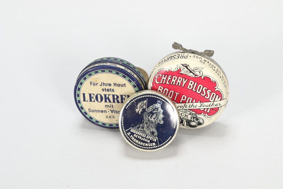 Þrjár litlar blikkdósir af mismunandi gerðum.