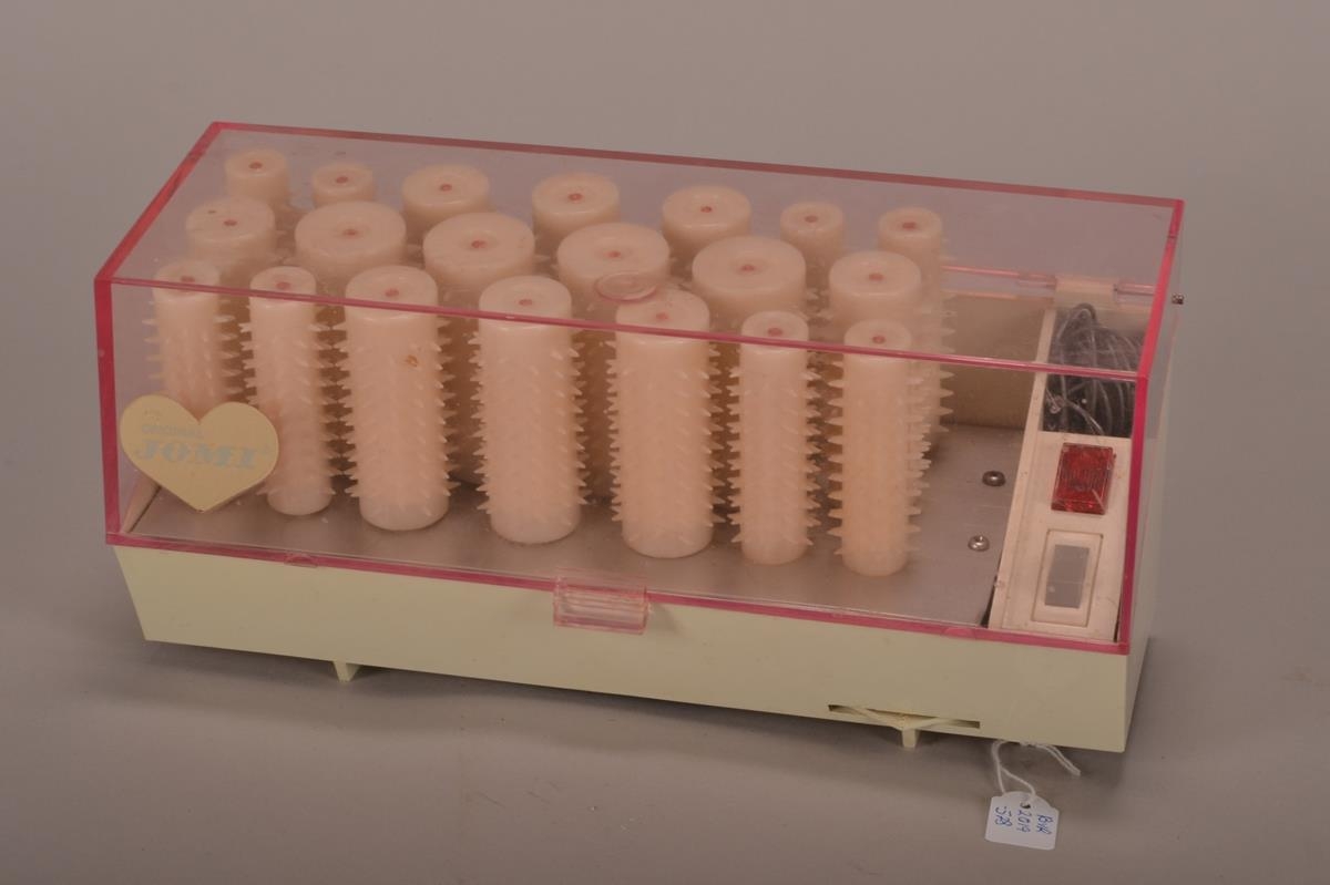 Hitarúllur í hitakassa og með upphaflegu spennunum. Kassinn er úr hvítu og bleiku plasti. Sigurbjörg fékk rúllurnar að gjöf frá foreldrum sínum þeim Jóni Arasyni Valdimarssyni og Guðrúnu Sigríði Sigurðardóttur.