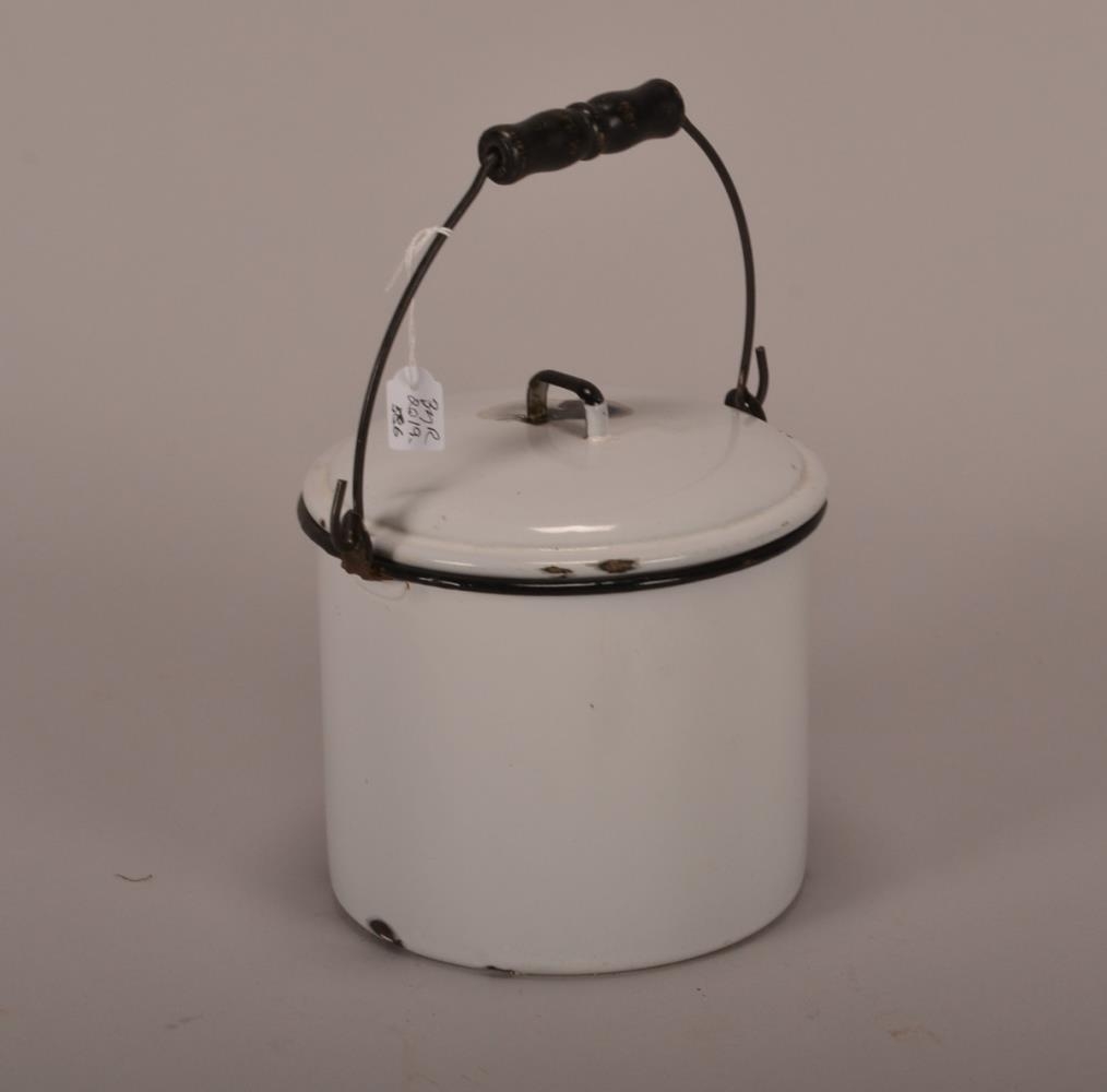 Hvít emeleruð fata með loki og handfangi, svröt rönd á efstu brún og svart viðarhandfang.