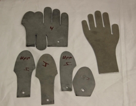 Vettlingasnið úr ál sem komu frá Dúkaverksmiðjunni með vinnuvettlingaframleiðslunni. Sniðin eru frá upphafi vinnuvettlingaframleiðslu á Akureyri. Stærð: 4.