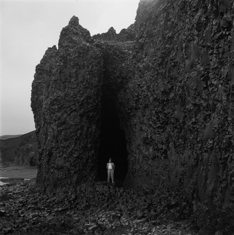 510 Snæfells- og Hnappadalssýsla. Tröllakirkja. Valdimar Hallbjörnsson, síðasti ábúandi í Einarslóni stendur í „dyrum“ (1935).