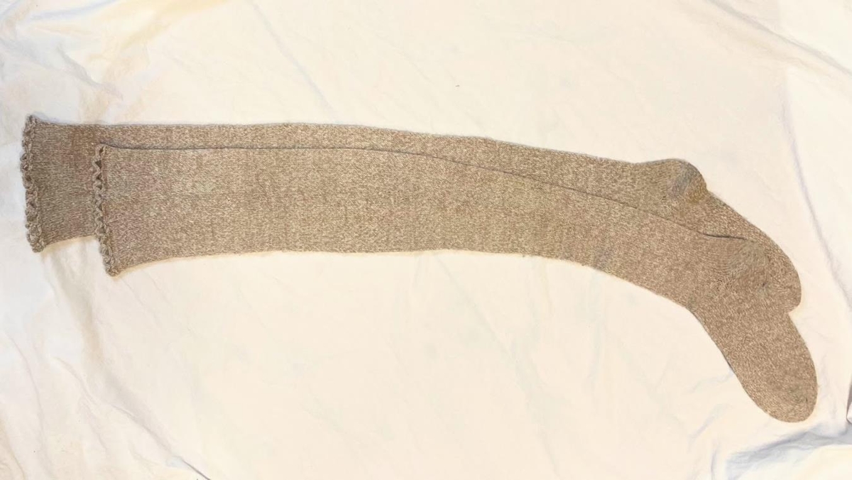 Kvensokkar, háir. Prjónaðir af Kristveigu Björnsdóttur, Skógum úr heimaunnu, íslensku bandi. Þráður rakinn úr útlenskum sokk prjónaður með.