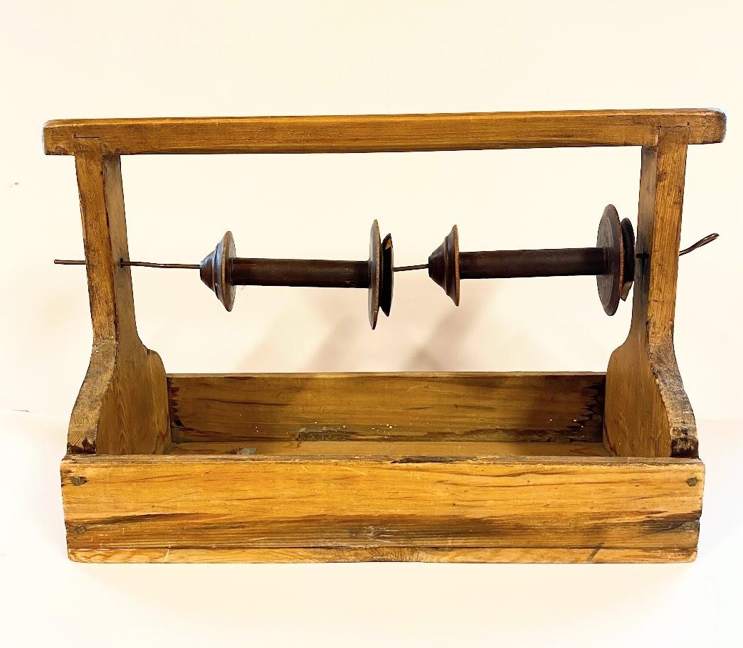 Snældustóll, 3 snældur fyljga með. Gæti verið eftir föður þeirra systra en hann var smiður.