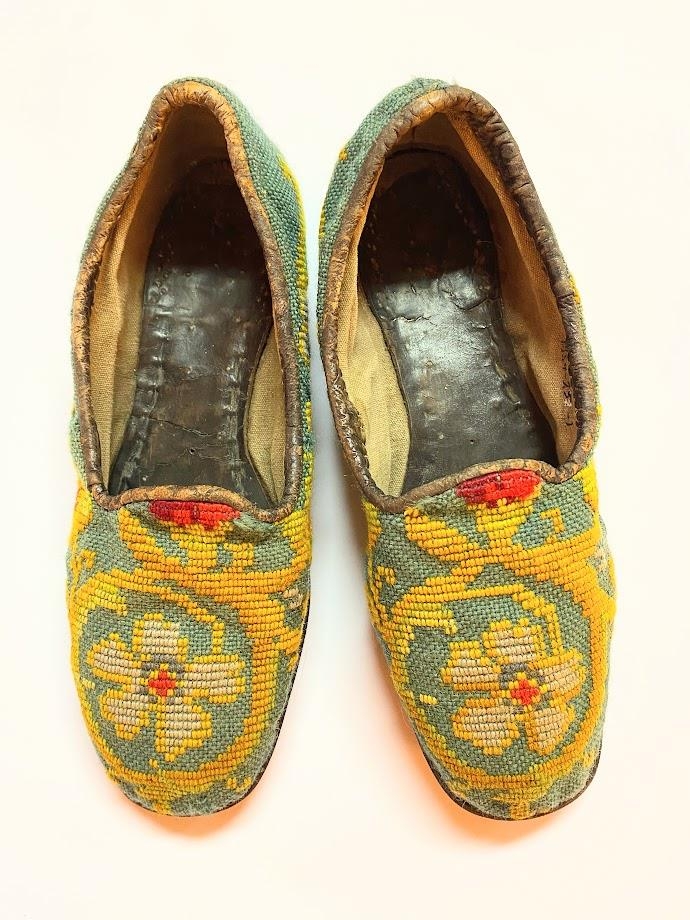 Saumaðir inniskór með leðurbotni. Yfirborðið er úr grænum ullarjava sem í hefur verið saumað fallegt rósamunstur með krosssaumi. Rannveig Gunnarsdóttir, f. 1901, frá Skógum í Öxarfirði gerði inniskóna og gaf. Yfirborðið á skónum saumaði hún 1913-1914 í Skógum, þá 13 ára. Seinna notaði eiginmaður hennar, Björn Kristjánsson skóna.