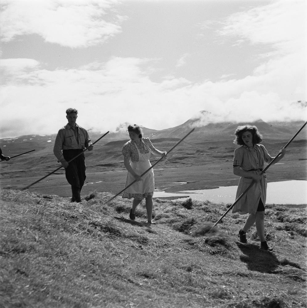 623 Snæfells- og Hnappadalssýsla. Heyskapur í Mávahlíðartúni. Tvær konur og karlmaður raka. Sigurður Magnússon. Elínborg Ágústsdóttir, (f. 17.09.1922). Jóna Ágústsdóttir (f. 30.06.1925). Ágúst Ólafsson (f. 21.08.1897), sér aðeins í höndina á honum.