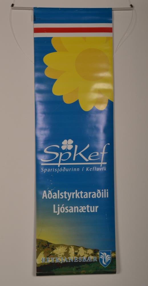 Blátt og grænt Ljósanæturflagg merkt SpKef sem aðalstyrktaraðila Ljósanætur.