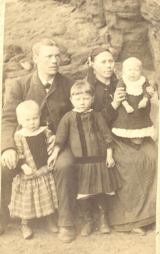 Sveinn Jónsson snikkari ásamt fyrstu konu sinni af fjórum, Guðrúnu Runólfsdóttur og þremur af fjórum börnum þeirra hjóna, Sigurveigu Guðrúnu, Júlíönu og Sveini Magnúsi.