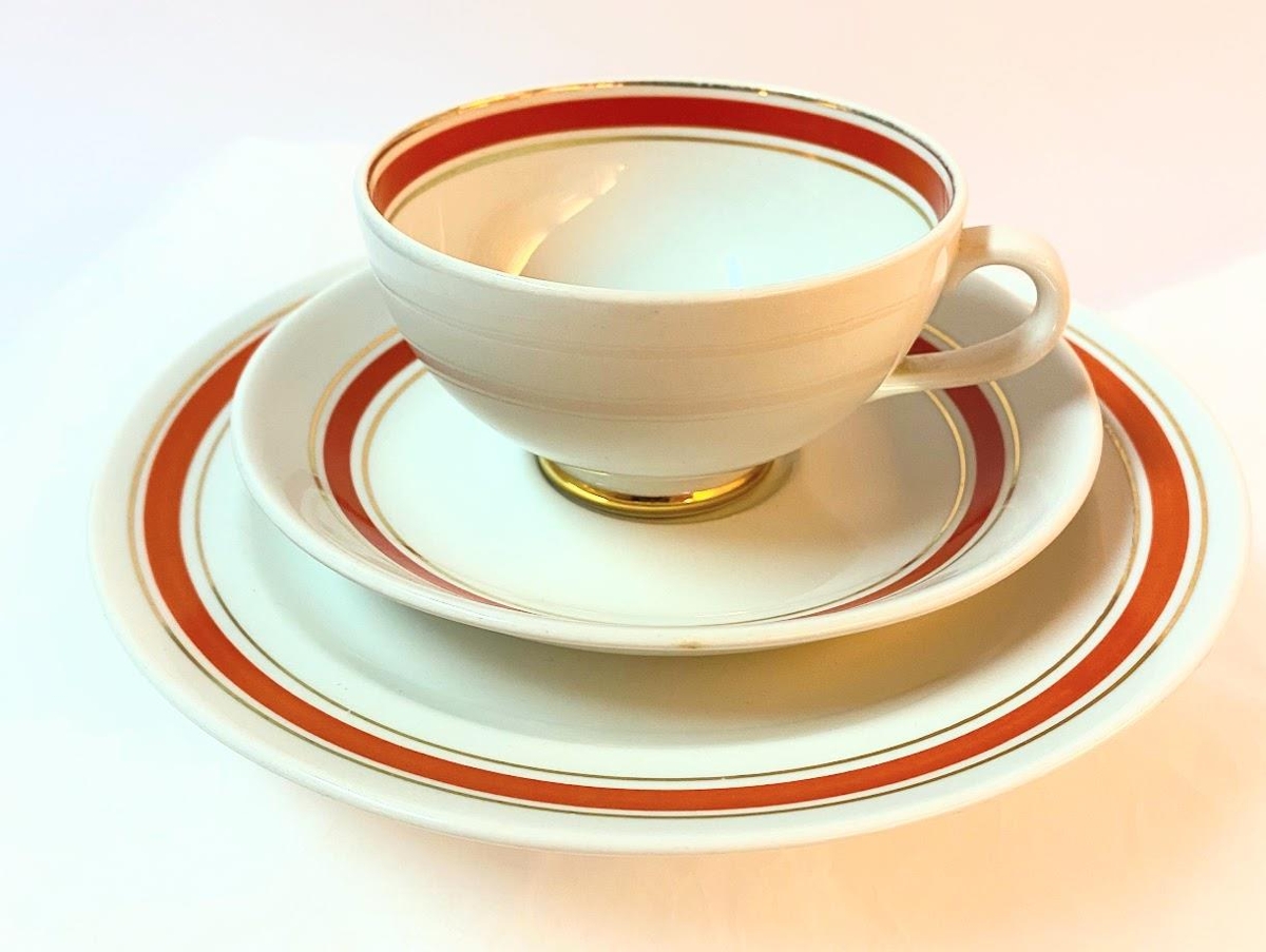 Bollapar og kökudiskur. Hvítt með rauðri og gylltum röndum. Er úr búi Kristínar og Einars í Garði Núpasveit, síðasti bollinn úr 6 manna stelli.