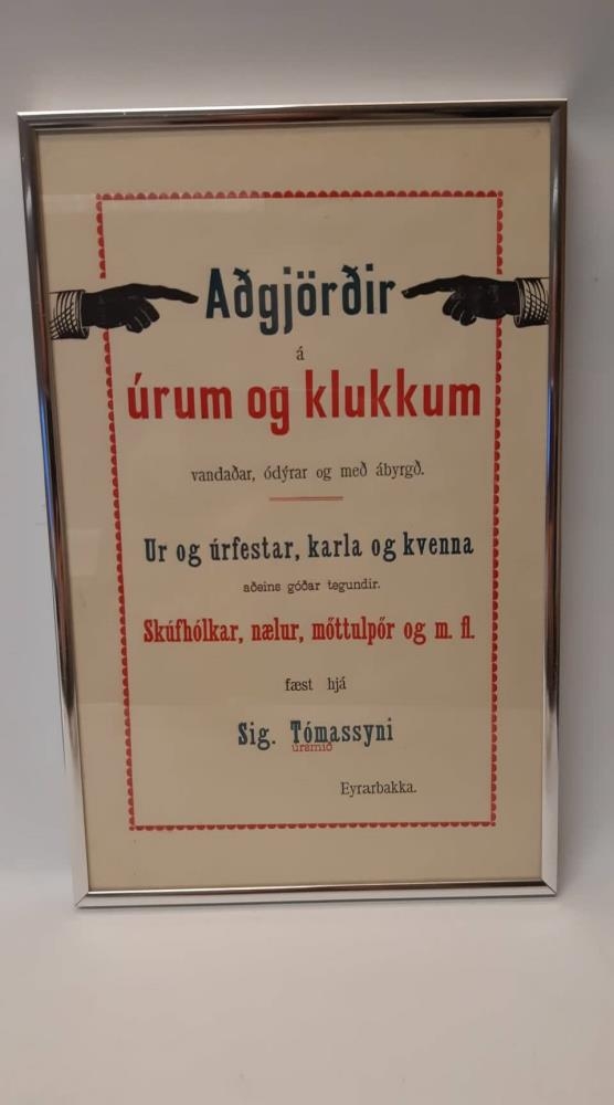 Innrömmuð auglýsing fyrir úrsmiðinn Sig. Tómasson á Eyrarbakka.