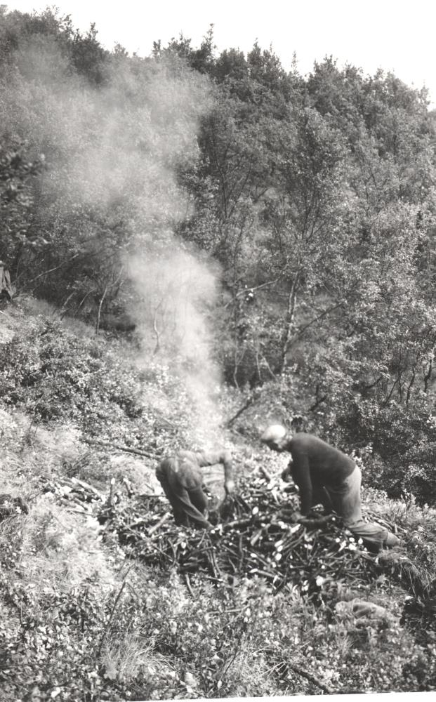 Bræðurnir Ragnar og Jón Stefánssynir gera til kola í Skaftafelli. Ljósmynd tekin af Vigfúsi Sigurgeirssyni í tengslum við kvikmyndir sem Kvikmyndasjóður Skaftfellinga lét gera á árunum 1952-1958 í Skaftafellssýslum og fjalla um horfna atvinnu-, menningar- og lifnaðarhætti auk kynningar á byggðarlögum og landslagi í sýslunum. Myndirnar greina m.a. frá meltekju og kolagerð, sem þá voru með öllu horfnir atvinnuhættir, um fýlatekju, fiskveiðar í sjó og vötnum, samgöngur á sjó, í lofti og á landi, bústörf fyrir daga vélvæðingar og kvöldvökuna sem kölluð hefur verið eins konar háskóli landsins.