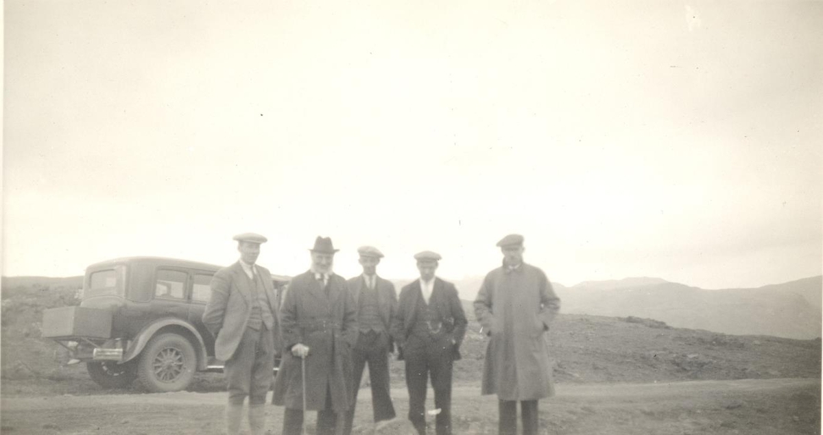 Fimm sparibúnir karlmenn. Á bak við þá bifreið. Aftan á mynd stendur að þeir séu á leið austur í Mýrdal. Lengst t.h. standa bræðurnir Ormur og Eiríkur Ormssynir.