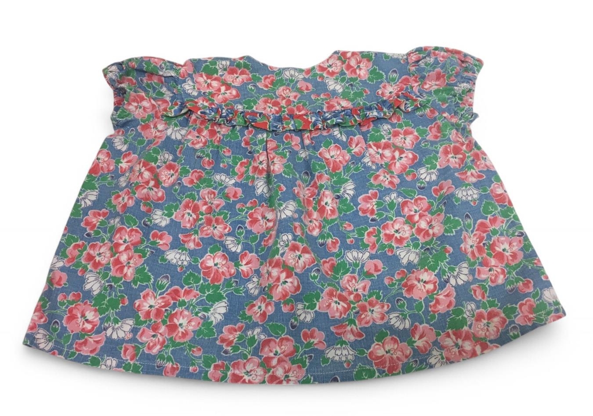 Ungbarnakjóll úr bómullarefni, blómamunstur, ljósblár grunnur, bleik blóm, græn blöð. Stutterma með berustykki, pífa úr sama efni undir berustykki.