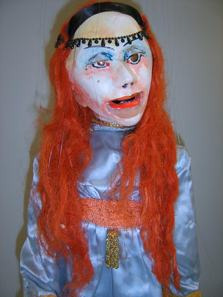 Strengjabrúða – Áfkona úr “Yfir kaldan Kjöl”. Álfkonan er með rautt hár í bláum kjól. Andlit er gert úr pappamassa. Búkur er úr trégrind og hendur og fætur eru skorin út í tré.