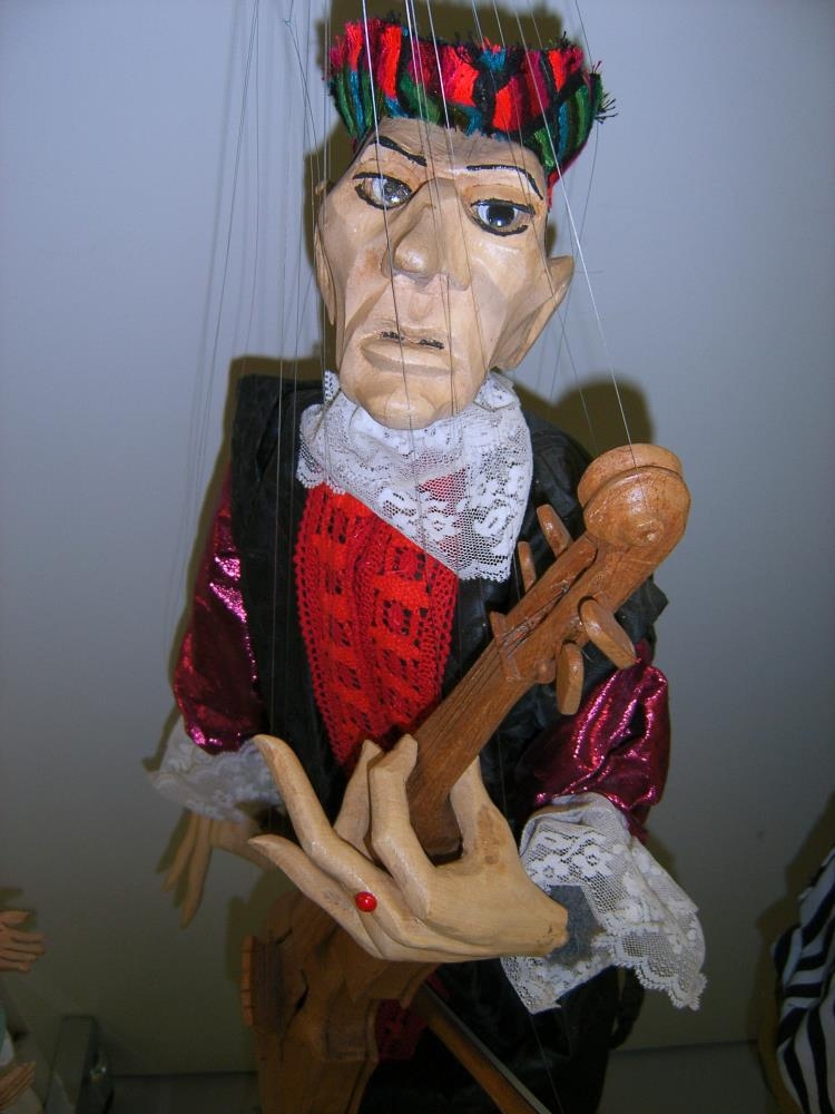 Strengjabrúða – fiðluleikari. Maður með fiðlu og höfuðfat. Andlit, hendur og fætur eru skorin út í tré. Andlit er málað.