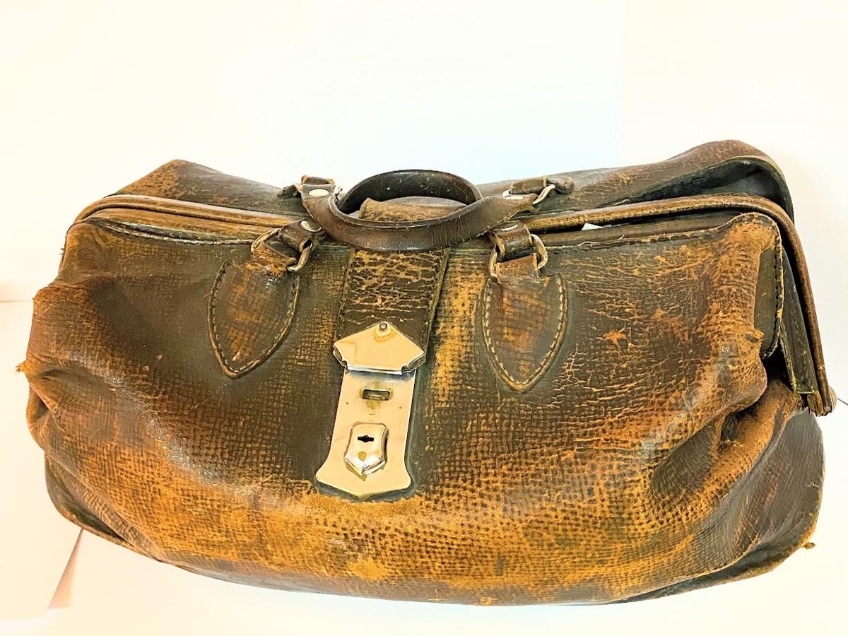Læknistaska, brún leðurtaska, illa farin af mikilli notkun.