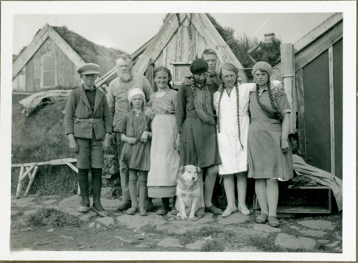 Heimafólk á sveitabær raðar sér upp fyrir frama bæjarhúin til hópmyndatöku. Heimahundurinn sest framan við hópinn að venju.