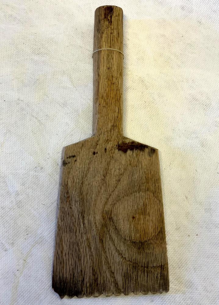 Spaði úr tré, notaður sem kíttisspaði, smíðaður og gefinn af Jóni Halldórssyni frá Valþjófsstöðum.