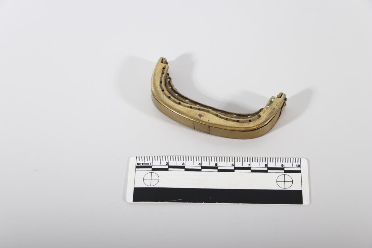 Látúnslæsing af peningabuddu. Buddan sjálf var úr görfuðu skinni. Var þá skinnið saumað á með þræði. Lengd 8,5 cm. Buddan hefur verið tvöföld.
