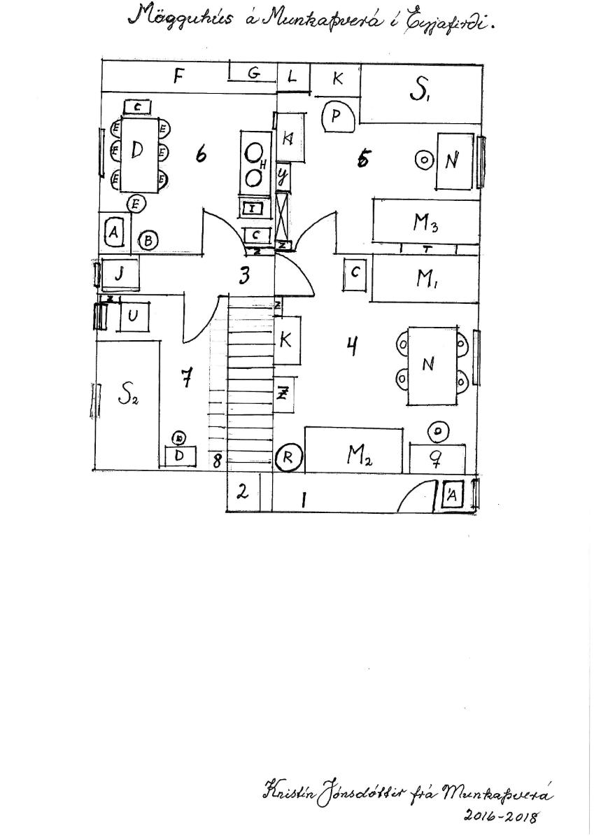 Grunnteikning af s.k. Mögguhúsi á Munkaþverá í Eyjafirði, neðri hæð, ásamt handskrifuðum skýringum. Ljósrit. Fylgir með ÞÞ 2012-3-126.