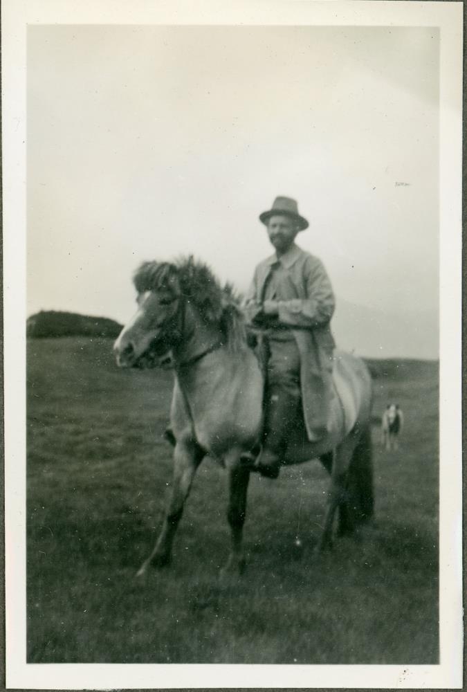 Karlmaður á hesti, hundur stendur álengdar. Við myndina er skrifað: Hans á Bleik.