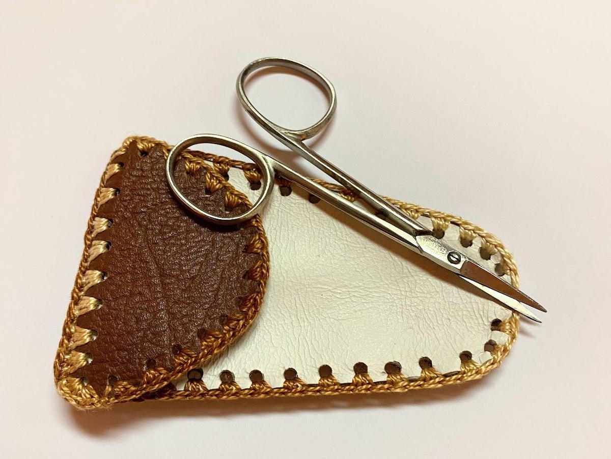 Hulstur úr leðri. Helga Helgadóttir (f. 1930, d. 2010 ) gerði hulstrið úr hvítu og brúni leðri. Heklað saman með brúnu bómullargarn. Stærð: L 10 x B 6 cm.