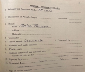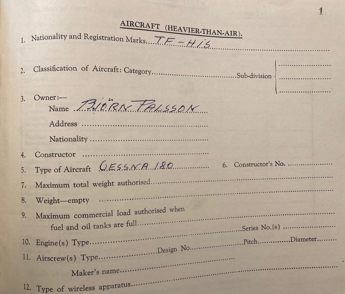 Logbók flugvélarinnar TF-HIS, Cessna 180. Bókin er fjórða logbók vélarinnar, blá að lit og með harðri kápu. Með svörtum prentuðum stöfum stendur: "Ministry of Civil Aviation M.C.A. Form 27" og "Aircraft Log Book". Einnig hefur verið handskrifað á hana: "TF-HIS. Bók no 4. Frá 2. júlí -1955 til 24/8-1956. TF-HIS #3A.