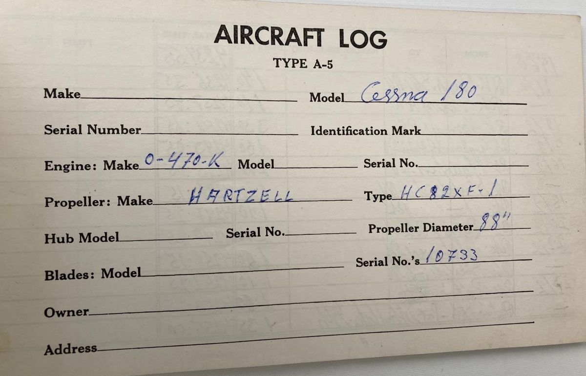 Fyrsta og síðasta færsla bókarinnar stemmir við skráningu á kápu bókarinnar. Tilgreindir eru brottfarar- og lendingarstaðir í bókinni og eru 252 flug skráð í bókina. Einnig eru skráðar skoðanir og viðgerðir á vélinni.