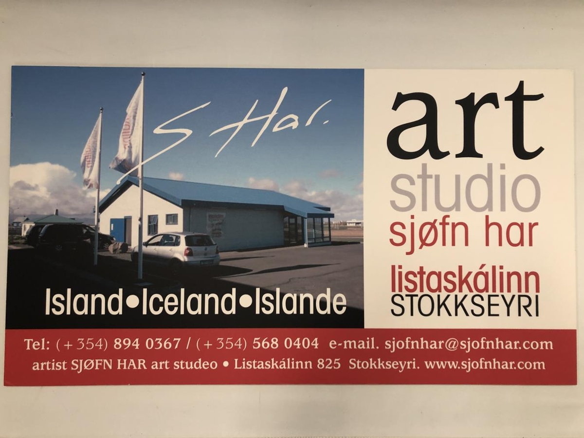 Auglýsingaskilti Sjafnar Har fyrir Listaskálann á Stokkseyri. Í Kaupfélagshúsinu, Hafnargötu 6.