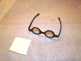 Gleraugu með hornspöngum. Umgerðir kringlóttar úr flötu horni, um 0.5 cm. Nefspöng með tveimur þríhyrndum götum við umgerðirnar. Eyrnaspangir nokkuð bognar að; langar, með blaðlaga auga í endanum.