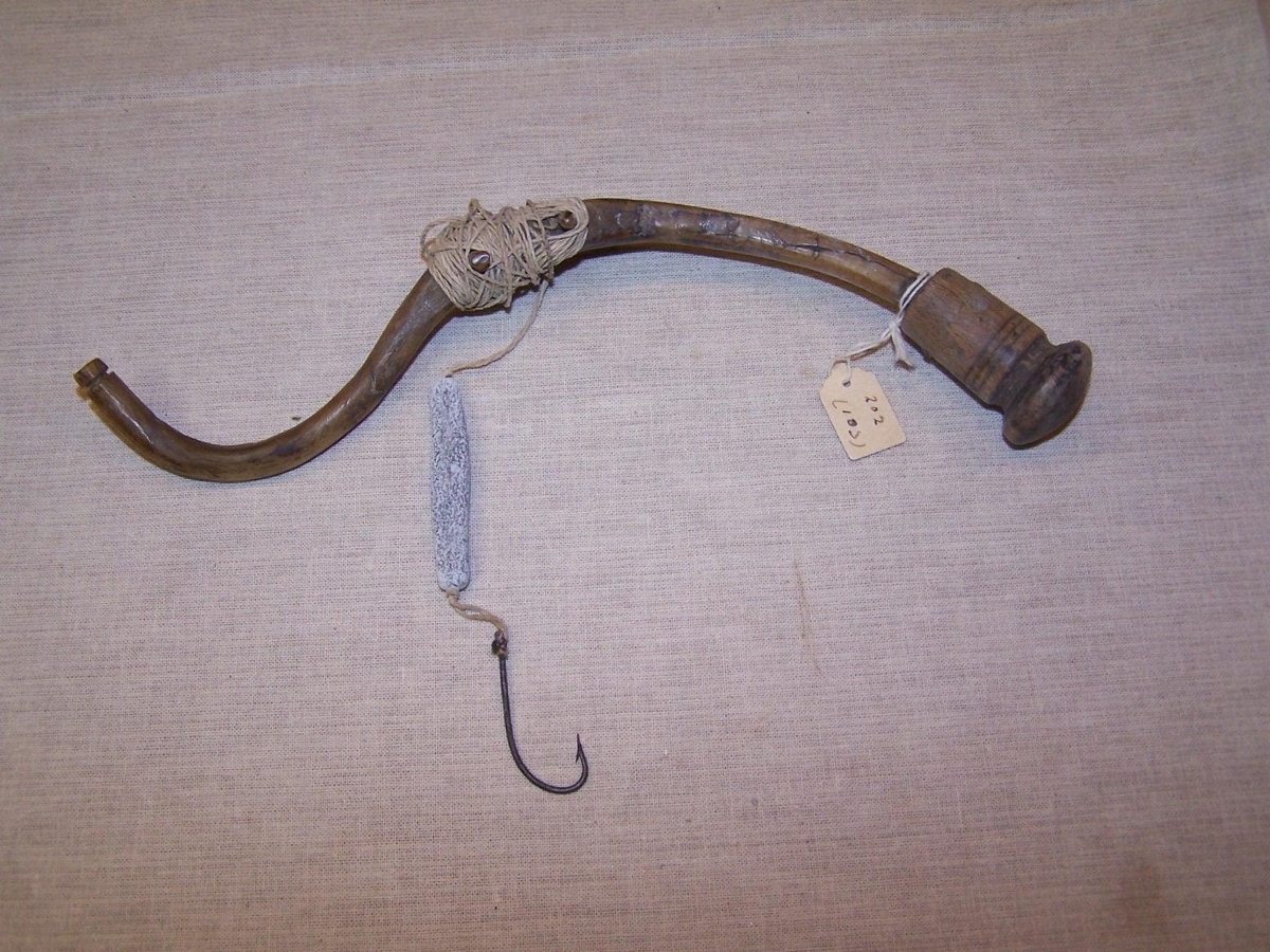 Dorg úr hrútshorni, s-laga. Með er taumur, sakka og öngull.