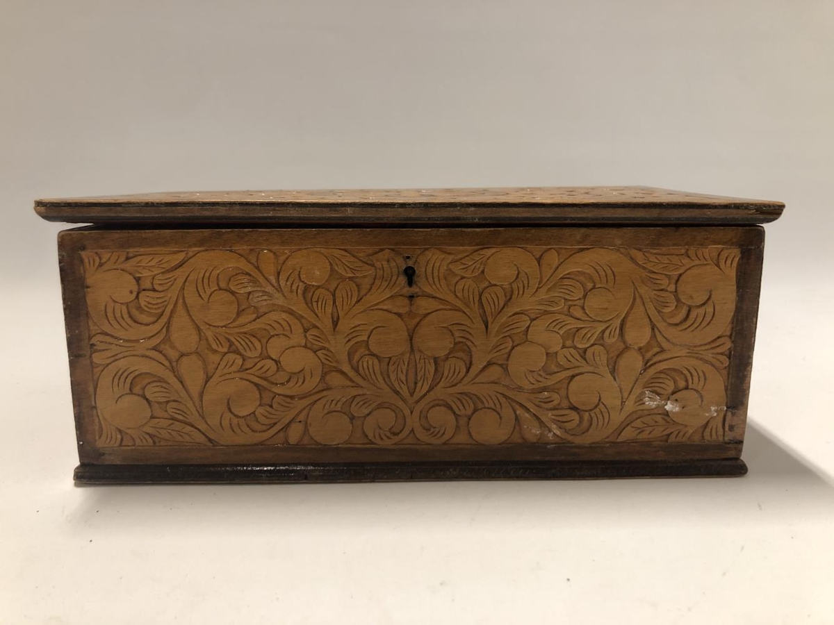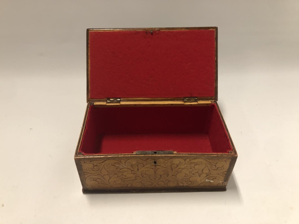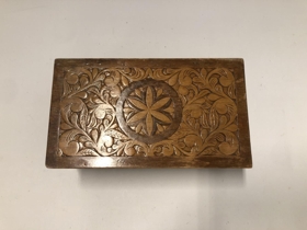 Kistill útskorinn á öllum hliðum og loki. Fóðraður rauðu filtefni.