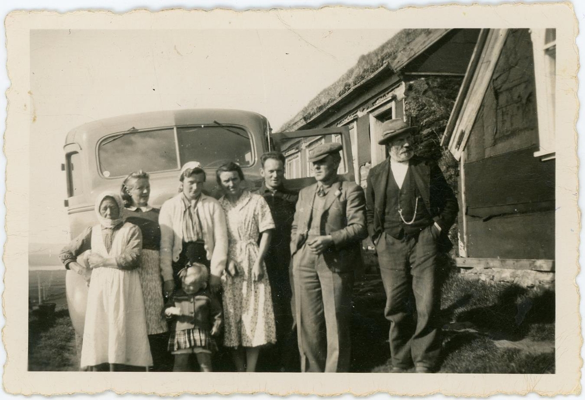 Hópur fólks framan við vörubíl/rútu sem stendur við íbúðarhús sveitabæjar. Á bakhlið er skrifað: Lengst til hægri Jónas Jónasson 24. maí 1881-17. jan. 1956, bóndi í Múla í Línakradal, V. Hún; 3. frá hægri Hrólfur Jónsson ?; 4. frá hægriGuðrún Jónsdóttir; 5. frá hægri Stefanía Eðvarðsdóttir frá Helgavatni, kona Guðmundar Jónassonar fjallabílstjóra; 7. frá hægri Kistín Ebenesersdóttir vinnukona.