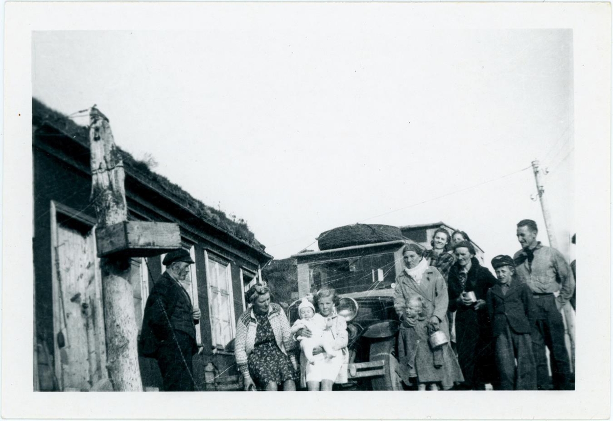 Á bakhlið er skrifað: Í Múla, Línakradal V. Hún. F.v.: Jónas Jónasson bóndi, Fanney Jónasdóttir (1912-1991), Sigrún Jónasdóttir, Erla Jónasdóttir, fjórar óþekktar manneskjur, Guðrún Jónsdóttir (í dökkri kápu með bolla í höndum) 1. sept. 1887-30. ágúst 1954). Guðrún var kona Jónasar, óþekktur drengur, Jónas R. Jónasson 1. feb. 1911-6. okt. 2008. Standa fyrir framan bifreiðina nr. H-7.