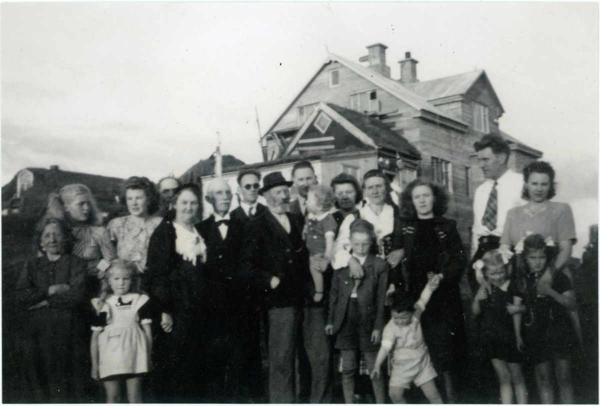 Allstór hópur fólks á öllum aldri framan við sambyggð hús sveitabæjar, torfbær t.v., timburviðbyggingar f. miðju og tvílyft steinhús aftanvið.