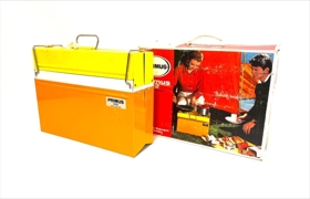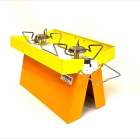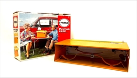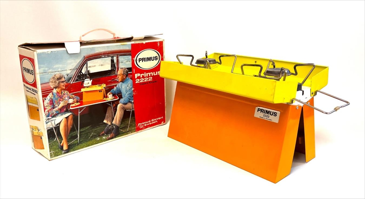 Ferðaprímus í upprunalegum umbúðum. Prímusinn er ferkantaður kassi sem hægt er að glenna í sundur og 2 brennarar á toppi. Efri partur er gulur, hvítt á milli og neðri spjöldin eru appelsínugul. Prímusinn er í vel með förnum kassa. Kassinn er á annarri hliðinni með mynd af eldra fólki sem situr við rauða bifreið í útilegustólum með borð með kaffikönnuna á prímus á nestis stundu. Á hinni hliðinni er yngra fólk í tjaldi að útbúa mat á prímusnum. Á kassanum stendur: PRIMUS. Primus 2222 made in Sweden. Primus-Sievert Sweden.