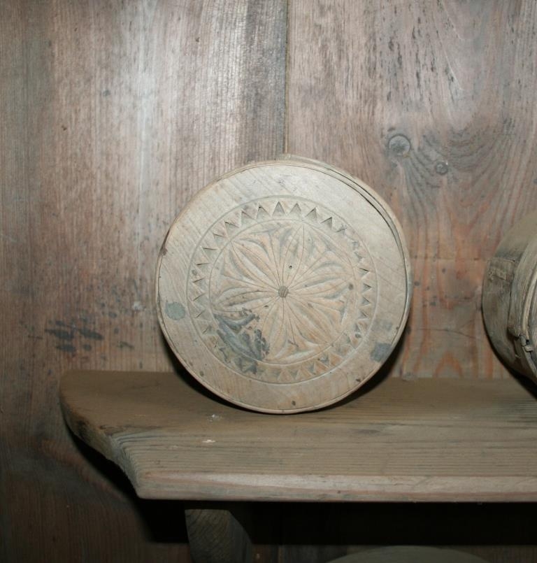Smjöröskjur, kringlóttar. Þvermál í botna 12.3 cm, þvermál í op 13 cm, hæð 7 cm.